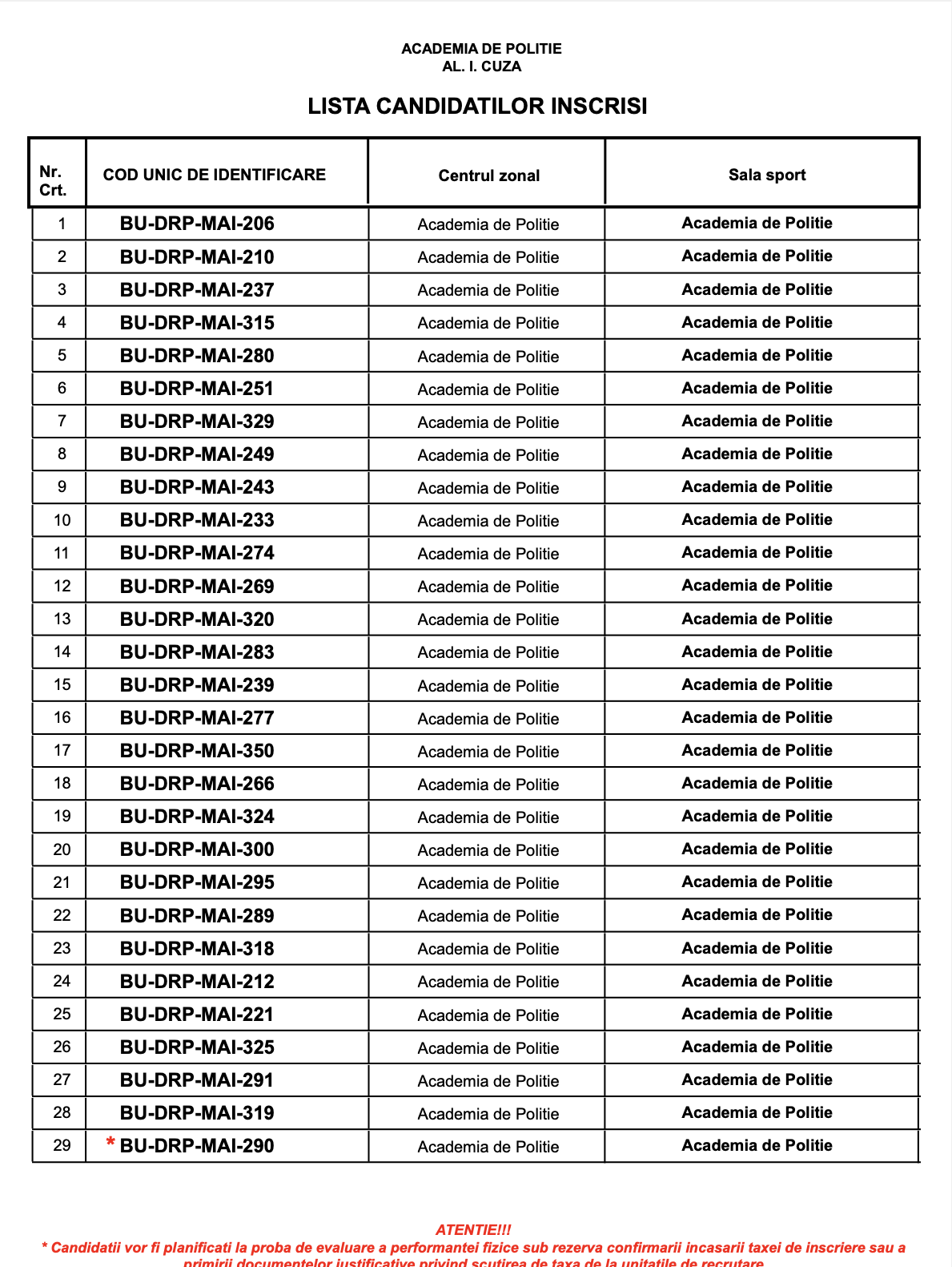 16.08.2023 - Academia de Politie Al. I. Cuza a publicat oficial lista candidaților înscriși și repartizarea pe grupe, pentru sustinerea probelor eliminatorii ale Examenului de Admitere 2023.