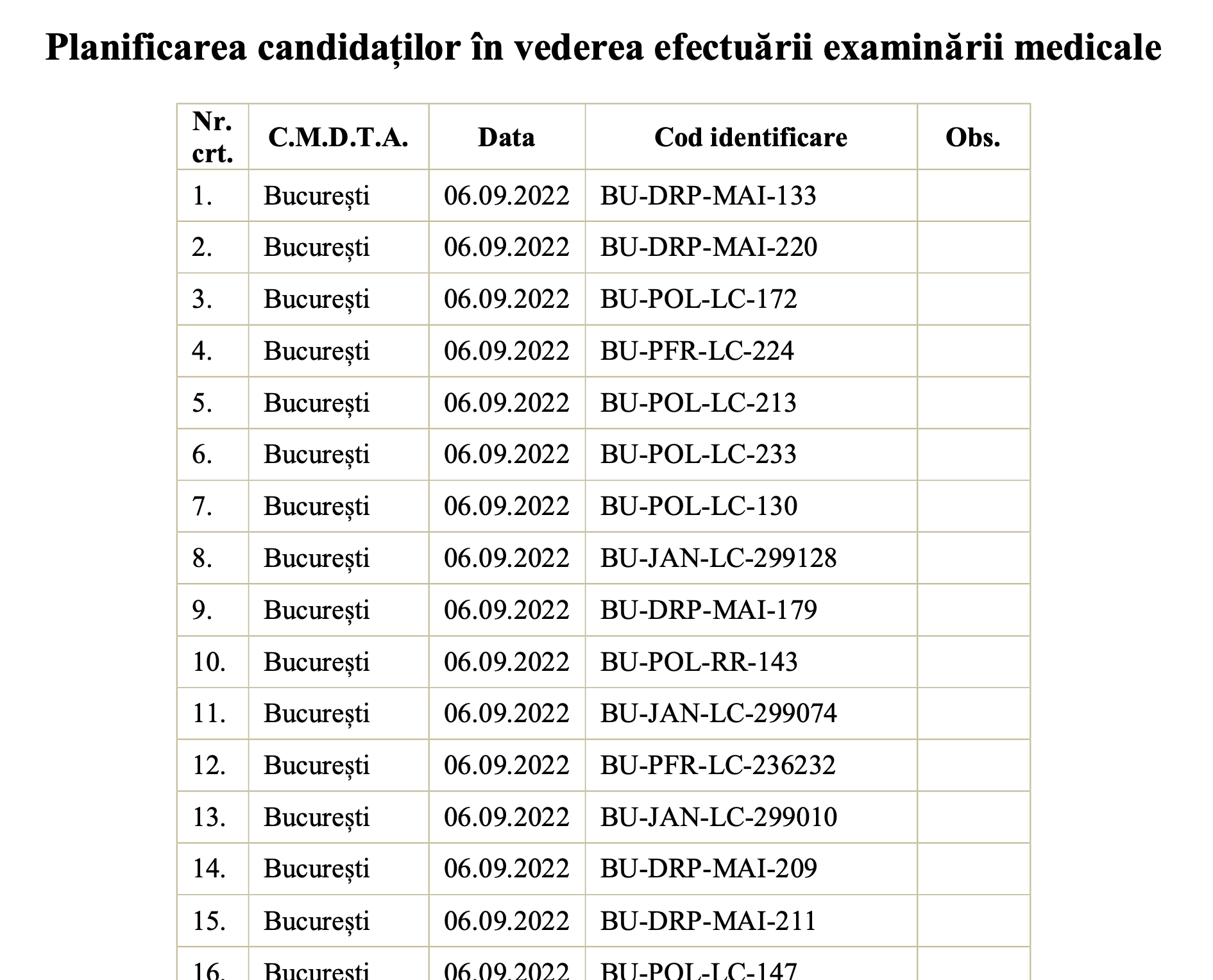 3. cu fișa medicală, completată în prima parte de către medicul de unitate, candidatul se prezintă conform planificării, la Centrul Medical de Diagnostic și Tratament Ambulatoriu (în funcție de județul în care are domiciliul/reședința) pentru efectuarea și consemnarea rezultatelor examinărilor medicale: