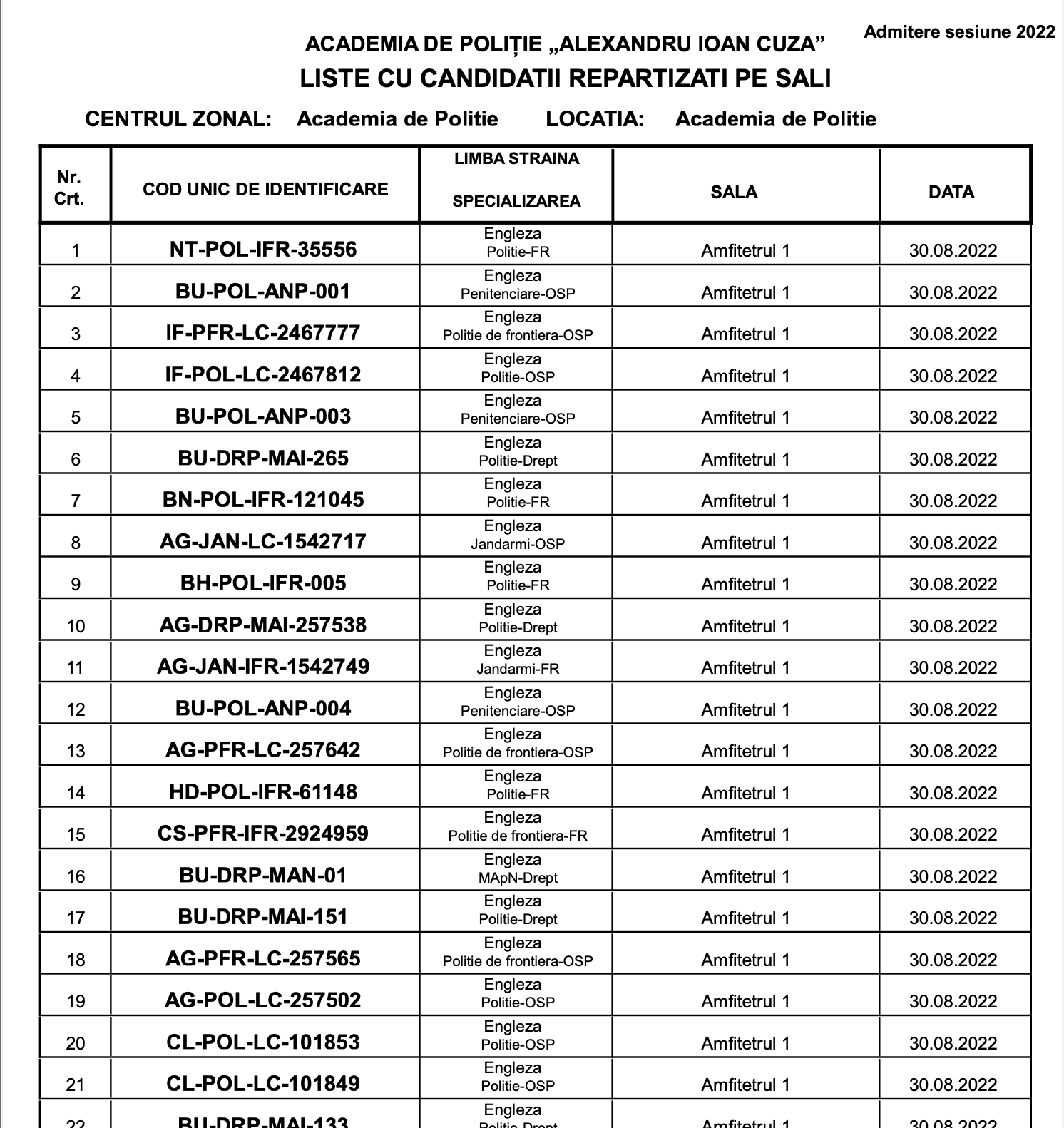 PROGRAMAREA SUSTINERII PROBELOR ELIMINATORII DIN ETAPA I A CONCURSULUI DE ADMITERE ACADEMIA DE POLITIE 2022