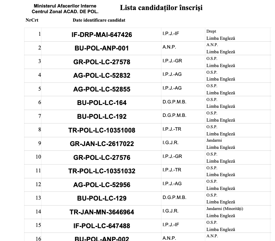 Lista candidaților înscriși la Examenul de Admitere la Academia de Politie "Al.I. Cuza 2021".