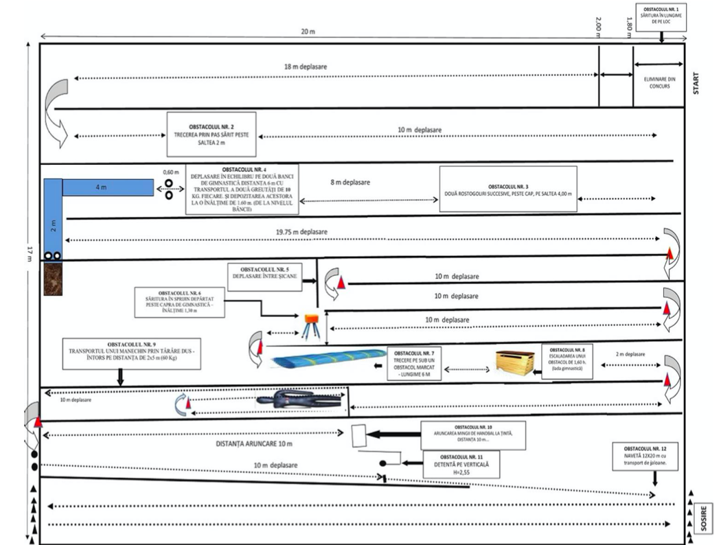 Evaluarea performanței fizice a candidaților constă în parcurgerea, în întregime, a traseului practic-aplicativ și a elementelor care îl compun, prin abordarea obligatorie a tuturor obstacolelor, în ordinea stabilită, conform schiței de mai sus. În situațiile expres precizate în conținutul prezentei anexe, parcurgerea unui obstacol în alt mod decât cel descris duce la penalizarea candidatului cu 3 (trei) secunde/obstacol sau eliminarea din concurs și declararea acestuia„nepromovat”. După finalizarea probei, penalizările acumulate sunt consemnate în borderoul de concurs și adunate la timpul realizat (cronometrat), rezultând astfel timpul final.